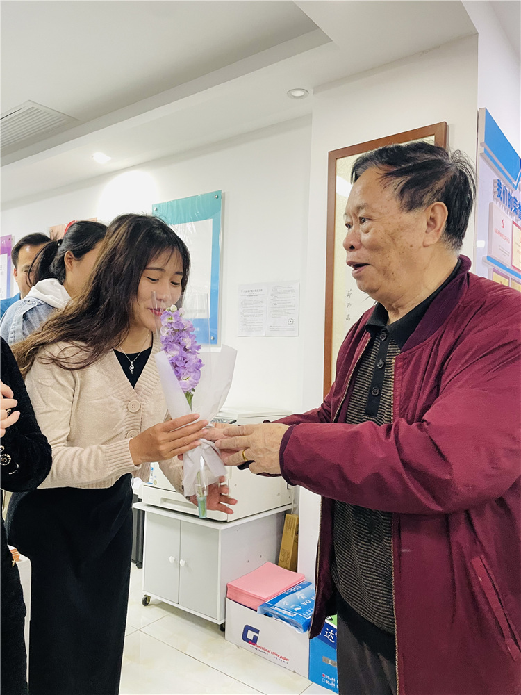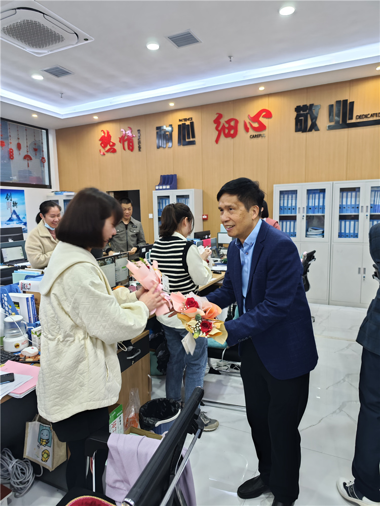 ▲市委組織部派駐集團第一書記冼慶榮為女職工送鮮花
