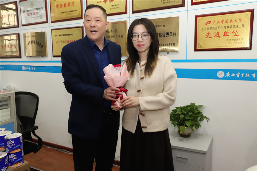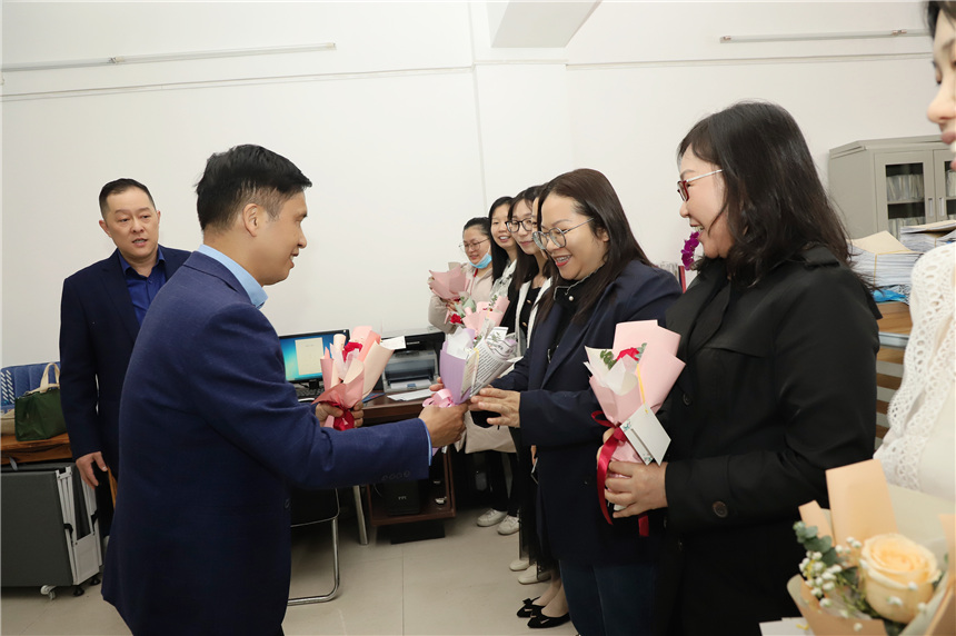 ▲培訓(xùn)學(xué)院院長趙彬為女職工送鮮花