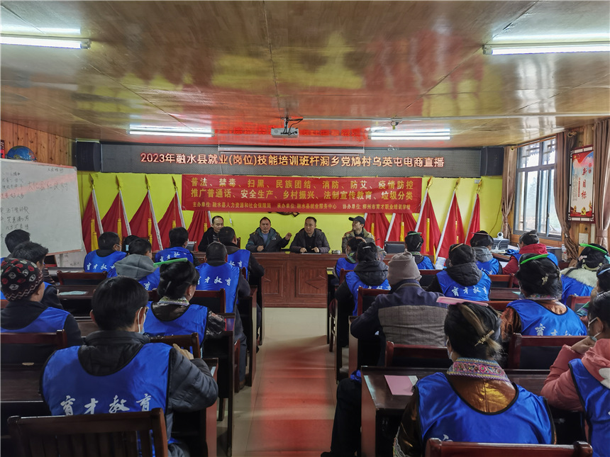 3月20日,由集團(tuán)培訓(xùn)學(xué)院承辦的“2023年融水縣就業(yè)(崗位)技能培訓(xùn)班——桿洞鄉(xiāng)黨鳩村烏英屯電商直播”在烏英屯順利開班。桿洞鄉(xiāng)就業(yè)社保服務(wù)中心主任王衍琛,黨鳩村村支書梁成張,二級(jí)電子商務(wù)師陳勇高出席開班儀式,共有33名黨鳩村學(xué)員參加了此次培訓(xùn)。本次培訓(xùn)旨在服務(wù)于鄉(xiāng)村振興,為農(nóng)民穩(wěn)步增收助力,拓寬農(nóng)民就業(yè)增收渠道。
