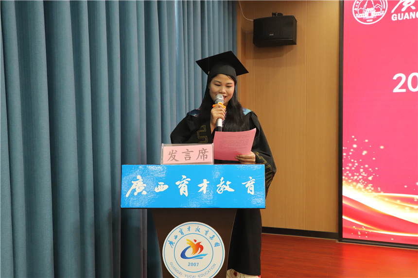 廣西師范大學(xué)繼續(xù)教育學(xué)院副院長何創(chuàng)雄向所有2023屆圓滿完成學(xué)業(yè)的同學(xué)們表示祝賀,何創(chuàng)雄副院長和同學(xué)們回顧了學(xué)校的辦學(xué)歷史,介紹了學(xué)校的辦學(xué)成就和發(fā)展思路,同時(shí)也肯定了育才教學(xué)點(diǎn)的辦學(xué)條件和學(xué)生規(guī)模,對教學(xué)點(diǎn)所取得的成績表示贊賞,希望大家無論走到何處,都能?;啬感?纯?。最后,他送給同學(xué)們?nèi)洚厴I(yè)贈言:一是要終身學(xué)習(xí),追求真理。追求真理,需要勇氣和毅力,需要高度獨(dú)立思考和創(chuàng)新的精神和能力,需要終身的學(xué)習(xí)。二是要艱苦創(chuàng)業(yè),自強(qiáng)不息。發(fā)揚(yáng)“尊師重道 敬業(yè)樂群”的校訓(xùn)精神,以知識、毅力和情操塑造自己,完善自己,艱苦創(chuàng)業(yè),自強(qiáng)不息。三是要海納百川,有容乃大。要擁有豁達(dá)的心態(tài),直面人生的高潮和低谷。