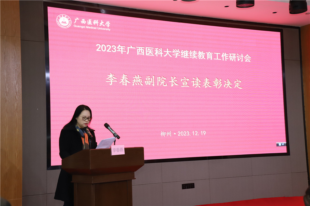 繼續(xù)教育學(xué)院副院長(zhǎng)李春燕宣讀《關(guān)于表彰廣西醫(yī)科大學(xué)2022-2023年度繼續(xù)教育招生工作先進(jìn)單位和先進(jìn)個(gè)人的決定》、《關(guān)于表彰廣西醫(yī)科大學(xué)2022-2023年度繼續(xù)教育教學(xué)工作先進(jìn)單位和先進(jìn)個(gè)人的決定》。因我教學(xué)點(diǎn)工作出色,獲評(píng)2022年度招生工作先進(jìn)單位,熊麗君、謝愛(ài)華、梁?jiǎn)W(xué)老師獲評(píng)招生工作先進(jìn)個(gè)人,熊麗君、劉婉麗、黃燕芳老師獲評(píng)教學(xué)管理先進(jìn)個(gè)人。