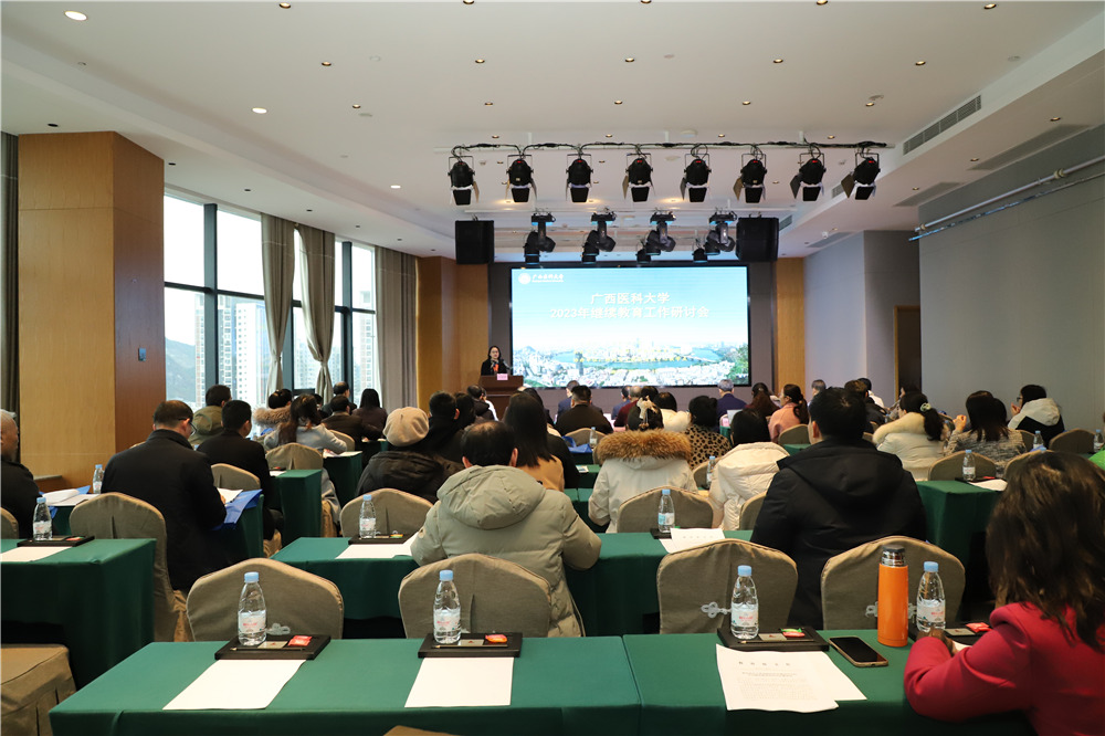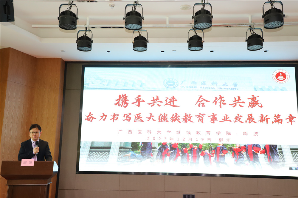 廣西醫(yī)科大學(xué)繼續(xù)教育學(xué)院院長(zhǎng)周波以《攜手共進(jìn) 合作共贏 奮力書(shū)寫(xiě)醫(yī)大繼續(xù)教育事業(yè)發(fā)展新篇章》為題從三個(gè)方面給大家作報(bào)告:一、共建廣西醫(yī)科大學(xué)辦學(xué)新優(yōu)勢(shì)。二、共擔(dān)繼續(xù)教育規(guī)范管理新使命。三、共創(chuàng)繼續(xù)教育發(fā)展新局面。周波院長(zhǎng)介紹了學(xué)校的發(fā)展歷程、辦學(xué)情況、專(zhuān)業(yè)建設(shè)、辦學(xué)理念、教師隊(duì)伍等基本情況,要求大家學(xué)習(xí)貫徹黨的二十大提出的“統(tǒng)籌職業(yè)教育、高等教育、繼續(xù)教育協(xié)同創(chuàng)新”的發(fā)展新戰(zhàn)略,推進(jìn)職普融通、產(chǎn)教融合、科教融匯,解放思想,開(kāi)拓創(chuàng)新,形成新的發(fā)展思路,推進(jìn)健康中國(guó)戰(zhàn)略,服務(wù)健康廣西,共同推動(dòng)廣西醫(yī)科大學(xué)繼續(xù)教育事業(yè)發(fā)展。
