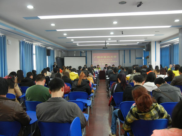 黃瑞誠副院長向全體新同學(xué)詳細(xì)介紹了廣西中醫(yī)藥大學(xué)的情況,并希望同學(xué)們能妥善處理好學(xué)習(xí)和工作之間的矛盾,能學(xué)有所成,為醫(yī)療事業(yè)貢獻(xiàn)出自己應(yīng)有的力量。他的講話高屋建瓴,深入淺出,語重心長,情真意切,同學(xué)們深受鼓舞,贏得了陣陣熱烈的掌聲。