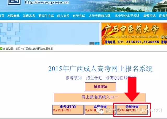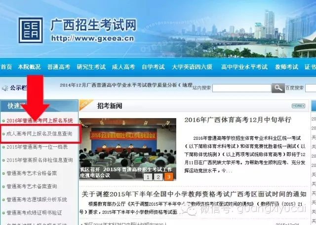 一、登錄廣西招生考試院網(wǎng)站:http://www.gxeea.cn,點(diǎn)擊“成人高考網(wǎng)上報(bào)名及信息查詢”。