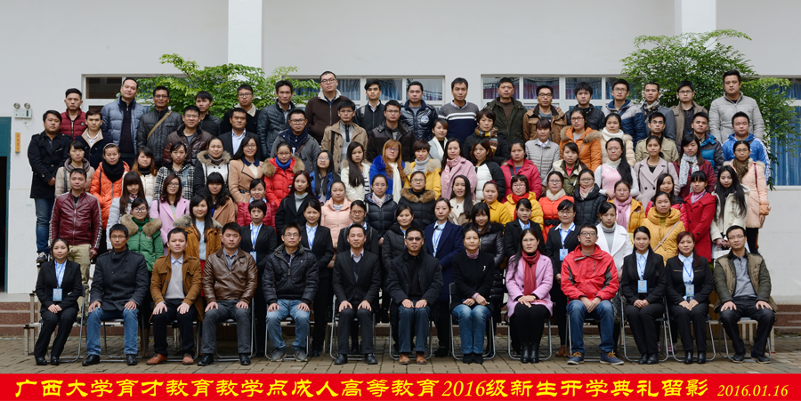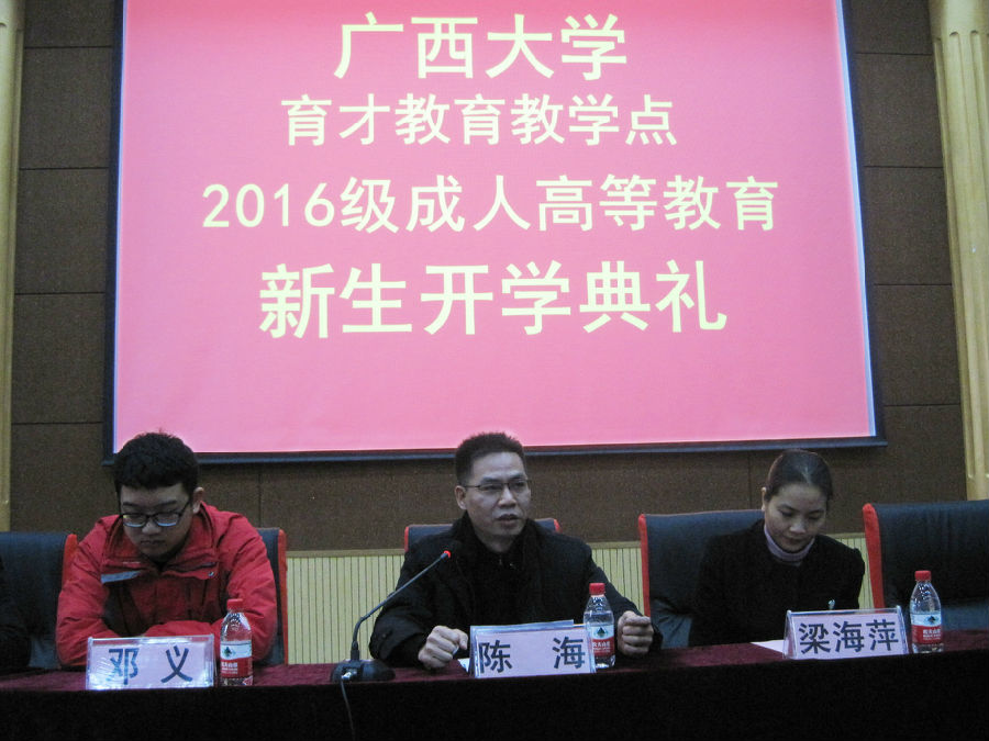 春天是一個播種的美好時節(jié),2016年1月16日上午10:00,廣西大學(xué)育才教育教學(xué)點2016級成人高等教育新生開學(xué)典禮在育才教育總部隆重舉行。廣西大學(xué)成教院陳海副院長、梁海萍主任、鄧義老師一行出席了開學(xué)典禮,陳海副院長作了重要講話。育才教育王志校長、李彩梅副校長以及來自柳州各行各業(yè)的近200名新生參加了開學(xué)典禮。雖然吹著凜冽的北風(fēng),還下起了小雨,但是此風(fēng)此雨仿佛是給同學(xué)們進行一次精神的沐浴和心靈的洗滌,也似乎在表明,不管任何風(fēng)雨都阻擋不了同學(xué)們立志成才、報效祖國的信心和堅毅。