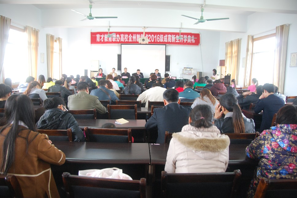 3月19日上午,育才教育全州縣教學(xué)點(diǎn)隆重舉行聯(lián)辦高校2016級(jí)成人高等教育新生開學(xué)典禮。廣西育才教育集團(tuán)黨支部書記、董事長蔣華老師帶隊(duì)到全州教學(xué)點(diǎn)調(diào)研并出席開學(xué)典禮,育才教育蔣亮副校長、全州分校蔣欽軍校長、桂林分校韋洪歡主任、黃肖曼主任以及來自全州縣的100多名新生代表參加了開學(xué)典禮,典禮由蔣欽軍校長主持。