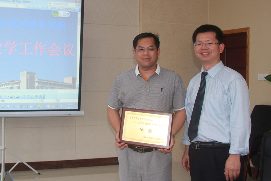 桂林醫(yī)學(xué)院成教院高東院長給育才教育負(fù)責(zé)人蔣華頒發(fā)優(yōu)秀獎牌