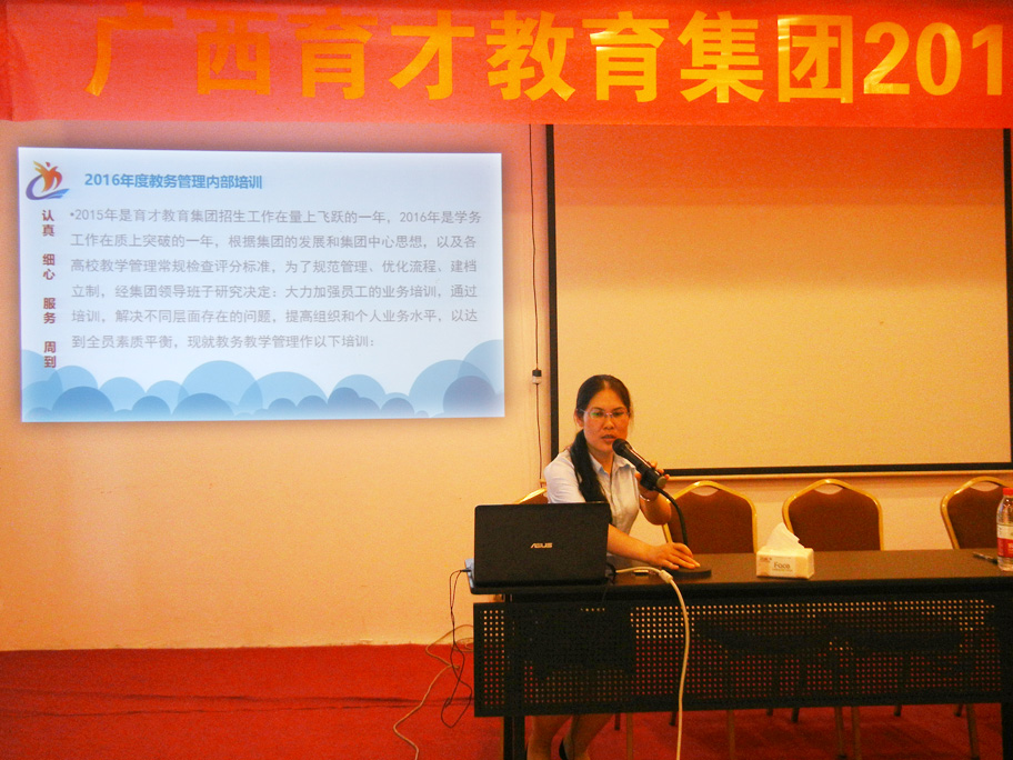 25日上午議程分四個內(nèi)容,一是王志校長宣讀各領(lǐng)導(dǎo)崗位任命文件;二是董事長、黨支部書記蔣華老師作了《依法辦學(xué)、規(guī)范招生、加強(qiáng)管理、拓寬渠道,穩(wěn)步創(chuàng)建2016年招生工作新局面》主題報告,主要內(nèi)容有以下幾點(diǎn):1.通報2015年全區(qū)成人高考的招生情況;2.通報2016年現(xiàn)階段育才的招生情況;3.分析2015年育才各類招生情況;4.傳達(dá)2016年國家新政策和高校的指導(dǎo)意見;5.新項(xiàng)目的介紹;6.完成2016年招生計劃具體的實(shí)施方案。三是醫(yī)學(xué)部蔣部長解讀2016年招生規(guī)定;四是常務(wù)副校長李彩梅老師通報各分校教學(xué)管理內(nèi)部檢查情況。