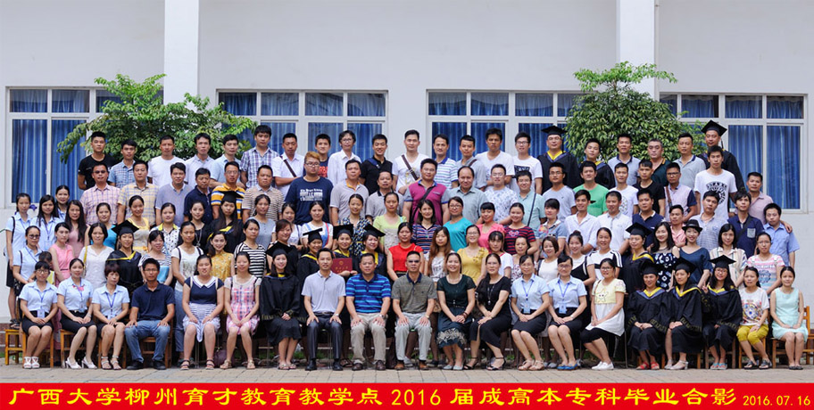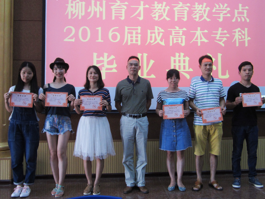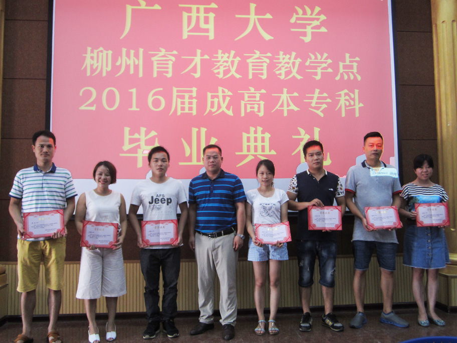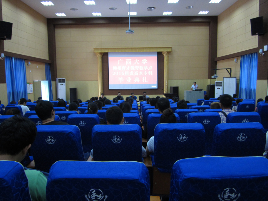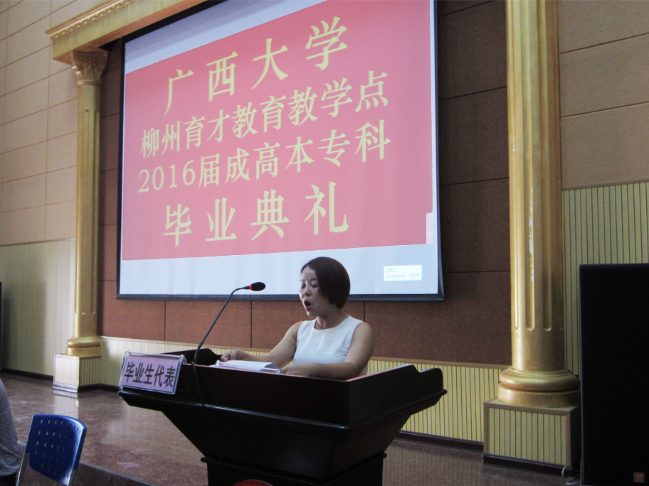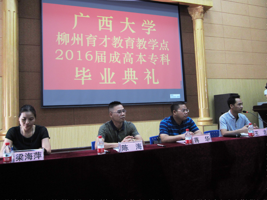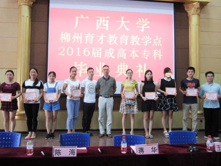 7月16日上午,廣西大學(xué)柳州育才教育教學(xué)點(diǎn)2016屆成高本??飘厴I(yè)典禮在育才柳州總部隆重舉行。廣西大學(xué)成教院副院長陳海、廣西大學(xué)成教院招生科科長梁海萍出席了畢業(yè)典禮,陳海副院長作了重要講話。廣西育才教育集團(tuán)黨支部書記、董事長蔣華老師、育才教育王志校長以及來自柳州市各區(qū)、縣的100多名畢業(yè)生代表共同參加了畢業(yè)典禮。典禮由王志校長主持。