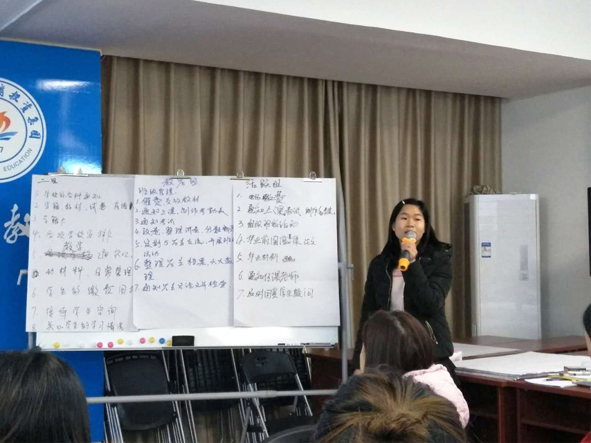 集團為此次培訓(xùn)做了精心的準備,選派了王志校長、李彩梅副校長以及優(yōu)秀的部門主任擔(dān)任培訓(xùn)老師。培訓(xùn)為期兩天半,主要內(nèi)容包括:育才的企業(yè)文化內(nèi)涵建設(shè)、學(xué)籍管理流程、教學(xué)管理流程、班主任崗位職責(zé)、人事行政制度等。培訓(xùn)以課件講授、小組討論、師生互動等多種形式組成。培訓(xùn)結(jié)束后對參訓(xùn)學(xué)員進行了統(tǒng)一考試,最后是總結(jié)分享會。分享會上,學(xué)員依次上臺表達了自己的學(xué)習(xí)心得,一致認為此次培訓(xùn)班的形式和內(nèi)容都非常好,幾天的學(xué)習(xí)讓她們獲益良多,紛紛表示要將自己所學(xué)運用到工作中去。
