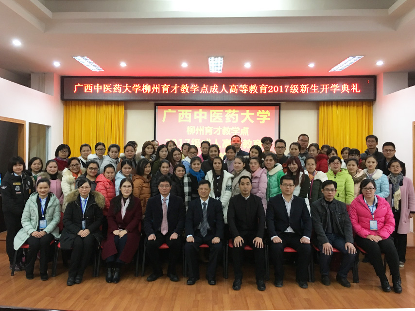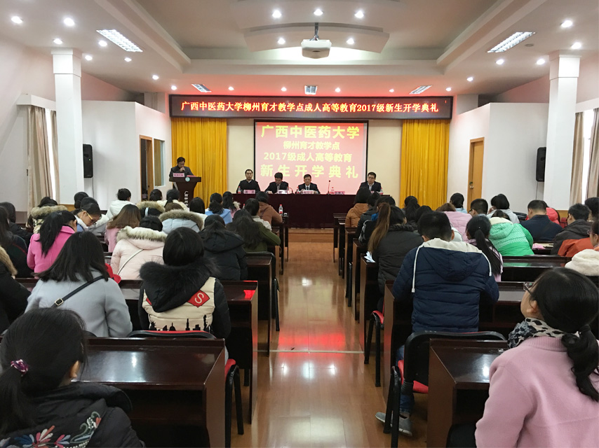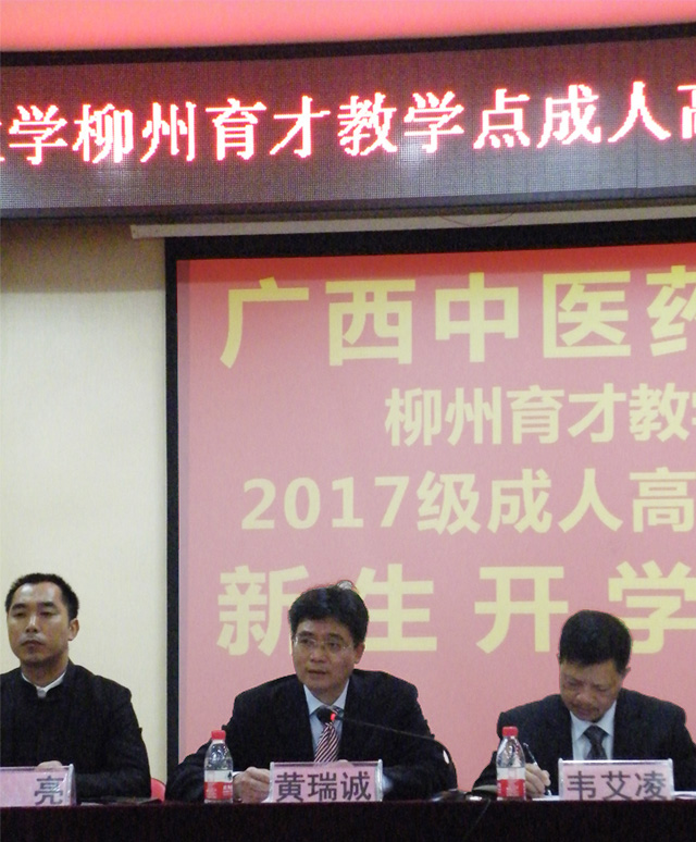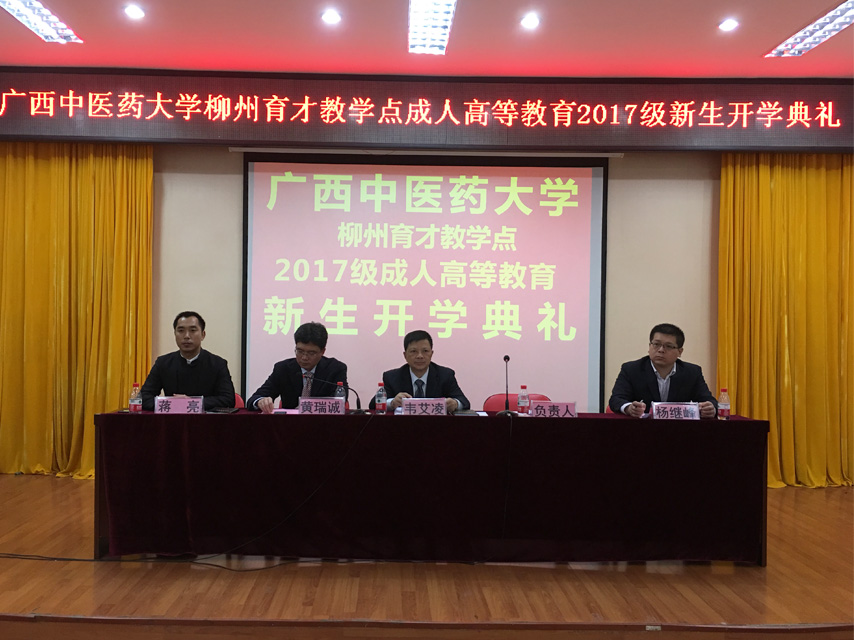 廣西中醫(yī)藥大學(xué)柳州育才教學(xué)點(diǎn)2017級(jí)成人高等教育新生開學(xué)典禮在柳州市中醫(yī)院勝利召開,廣西中醫(yī)藥大學(xué)成教院院長(zhǎng)、博士生導(dǎo)師、二級(jí)教授韋艾凌、副院長(zhǎng)黃瑞誠(chéng)、院長(zhǎng)助理、培訓(xùn)部主任楊繼峰出席開學(xué)典禮,韋艾凌院長(zhǎng)、黃瑞誠(chéng)副院長(zhǎng)作重要講話。育才教育李彩梅副校長(zhǎng)、蔣亮副校長(zhǎng)以及來自柳州各大醫(yī)院、衛(wèi)生院、醫(yī)藥公司和藥店等100多名新生代表共同參加了開學(xué)典禮。開學(xué)典禮由育才學(xué)工辦主任陳韻先主持。