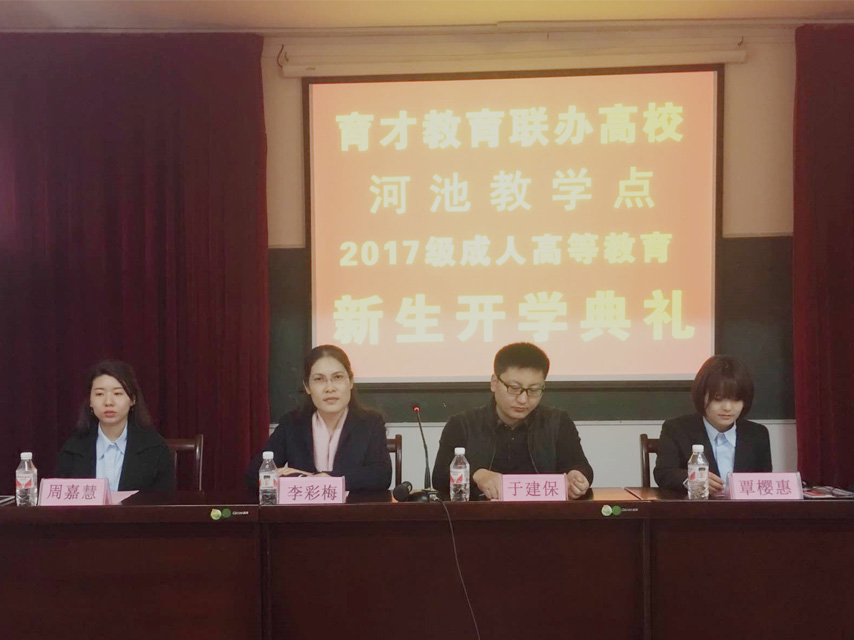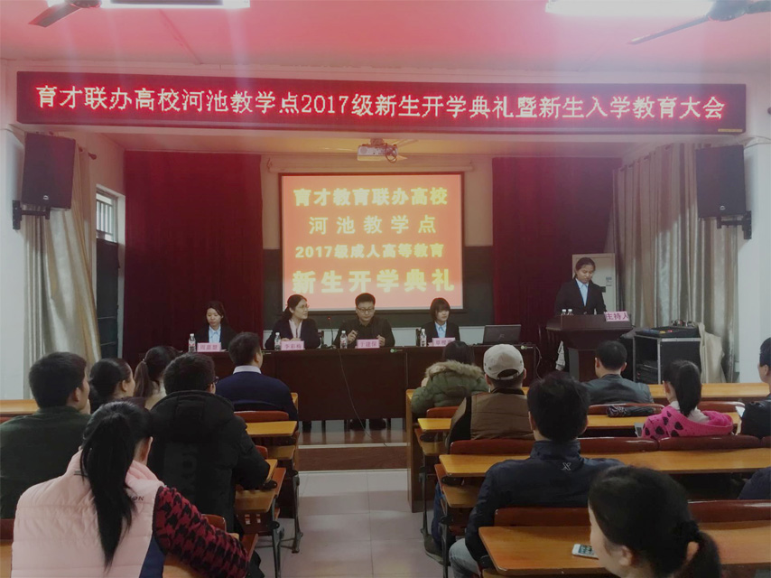 3月5日上午,育才河池分校隆重舉行育才聯(lián)辦高校河池分校2017級(jí)成人高等教育新生開學(xué)典禮,集團(tuán)副總、柳州市育才教育培訓(xùn)中心常務(wù)副校長(zhǎng)李彩梅、河池分校負(fù)責(zé)人于建保、教學(xué)管理老師梁森琰、周嘉慧、覃櫻惠出席典禮,來(lái)自河池市區(qū)及各縣的60多名新生代表參加了開學(xué)典禮,典禮由梁森琰老師主持。開學(xué)典禮結(jié)束后,李彩梅副校長(zhǎng)為全體新生作入學(xué)教育。