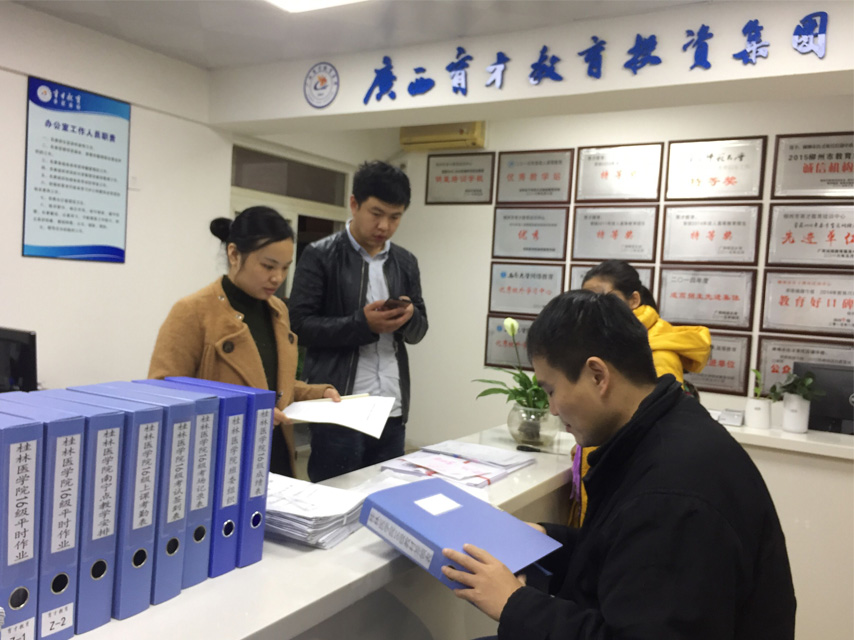 3月16日,桂林醫(yī)學院繼續(xù)教育學院主管學籍與考務的王欣老師、主管錄取與繳費的黃開西老師到育才南寧分校檢查指導。
