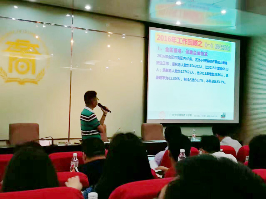 會(huì)議第一環(huán)節(jié)首先由廣西大學(xué)繼續(xù)教育學(xué)院副院長(zhǎng)陳海作2016年工作總結(jié)和2017年工作布置,并宣讀了2016年招生工作先進(jìn)單位表彰決定。