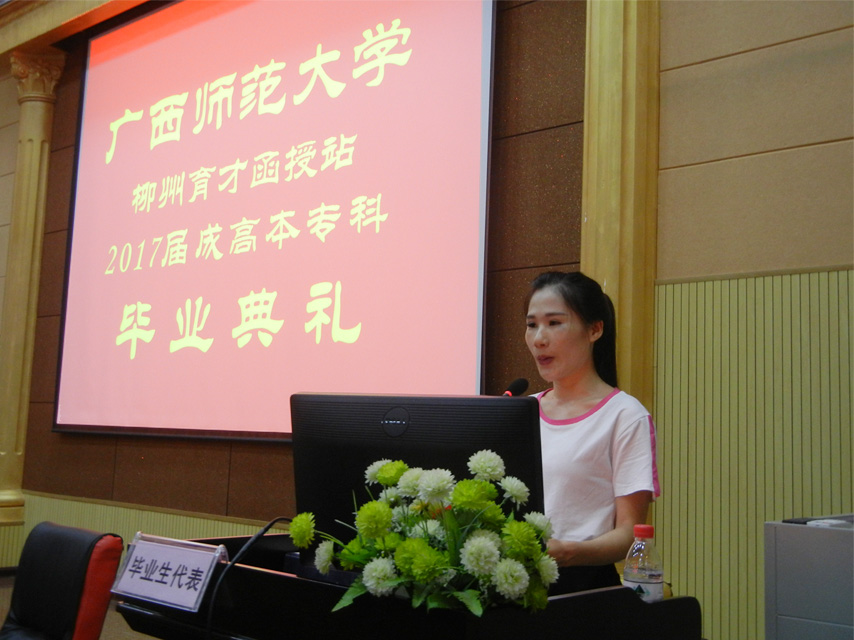 畢業(yè)典禮在莊嚴(yán)的國(guó)歌聲中拉開(kāi)序幕。劉玉紅院長(zhǎng)發(fā)表了熱情洋溢的講話,他首先代表學(xué)校向順利完成學(xué)業(yè)的畢業(yè)生們表示祝賀,勉勵(lì)畢業(yè)生在今后仍要保持一顆積極進(jìn)取的心,活到老學(xué)到老,學(xué)以致用,做生活的強(qiáng)者。2017年是廣西師范大學(xué)建校85周年,劉玉紅院長(zhǎng)誠(chéng)摯邀請(qǐng)畢業(yè)生回母校參加校慶活動(dòng)。