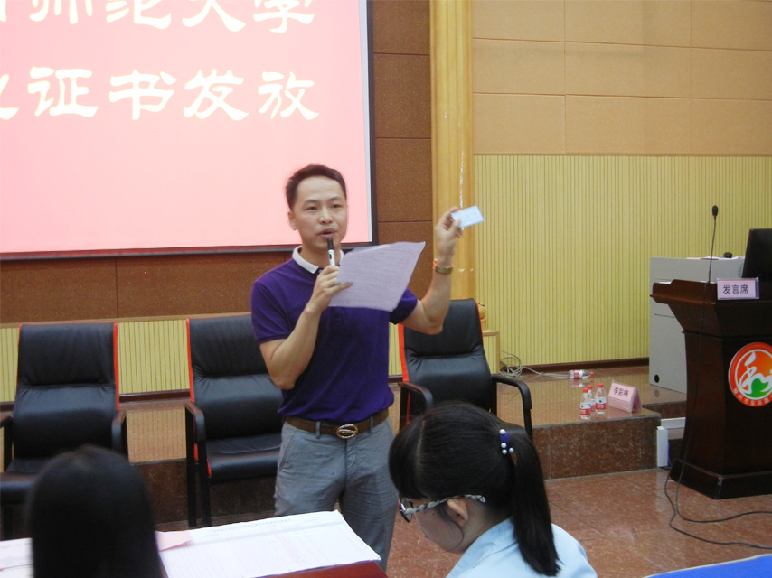 育才黨支部書(shū)記、董事長(zhǎng)蔣華老師向2017屆畢業(yè)生表示熱烈祝賀,對(duì)劉玉紅院長(zhǎng)的到來(lái)表示熱烈歡迎,向廣西師范大學(xué)送教上門(mén)表示衷心的感謝,希望畢業(yè)生學(xué)會(huì)感恩,不斷學(xué)習(xí),關(guān)心母校的發(fā)展,最后提醒畢業(yè)生妥善保管畢業(yè)證和畢業(yè)生檔案。
