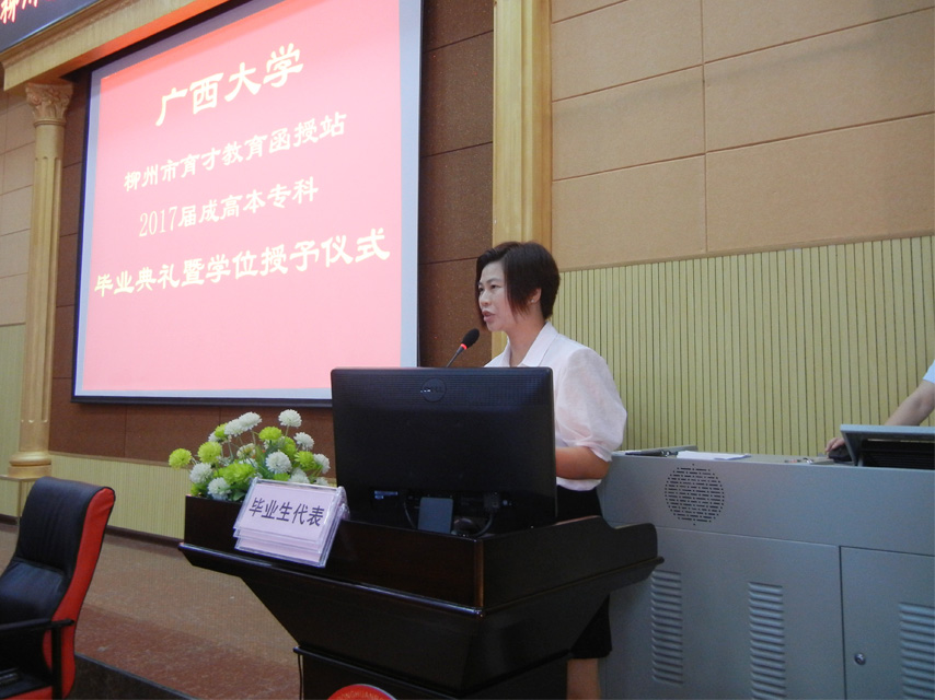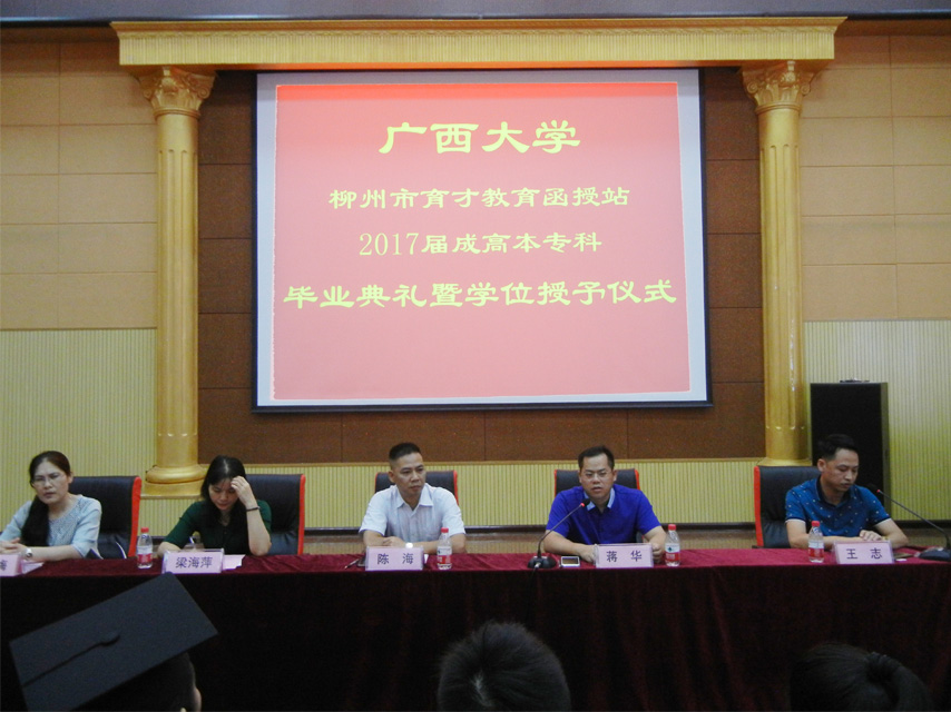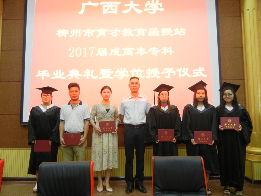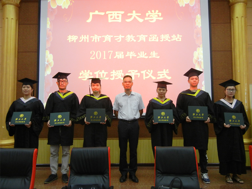 梁海萍科長宣讀了廣西大學(xué)繼續(xù)教育學(xué)院準予畢業(yè)決定、學(xué)位授予決定。陳海副院長為畢業(yè)生代表,獲得學(xué)士學(xué)位的畢業(yè)生代表頒發(fā)了證書。據(jù)悉,廣西大學(xué)柳州育才教育函授站2017屆成人高等教育共有594名畢業(yè)生,有300名畢業(yè)生獲得學(xué)士學(xué)位。