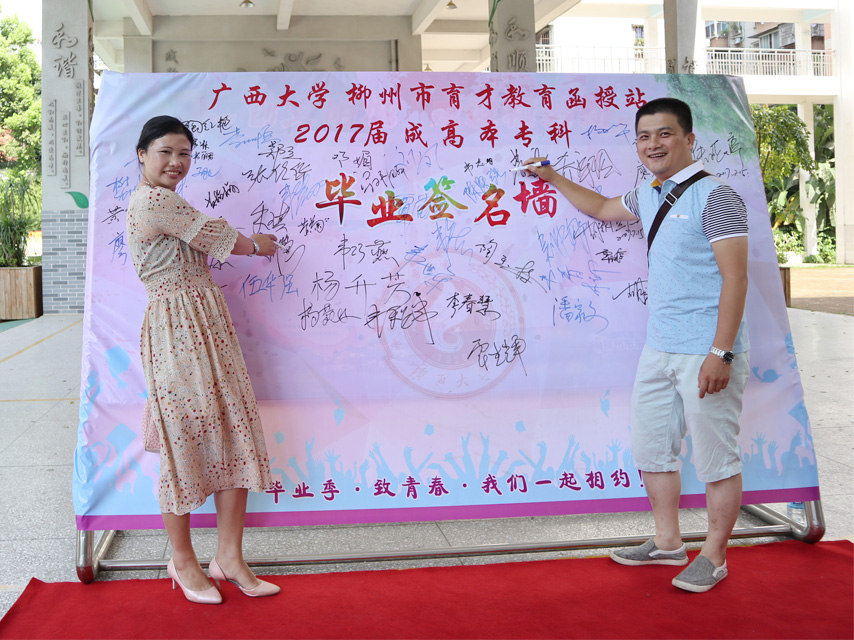 畢業(yè)生紛紛在簽名墻前簽名留影