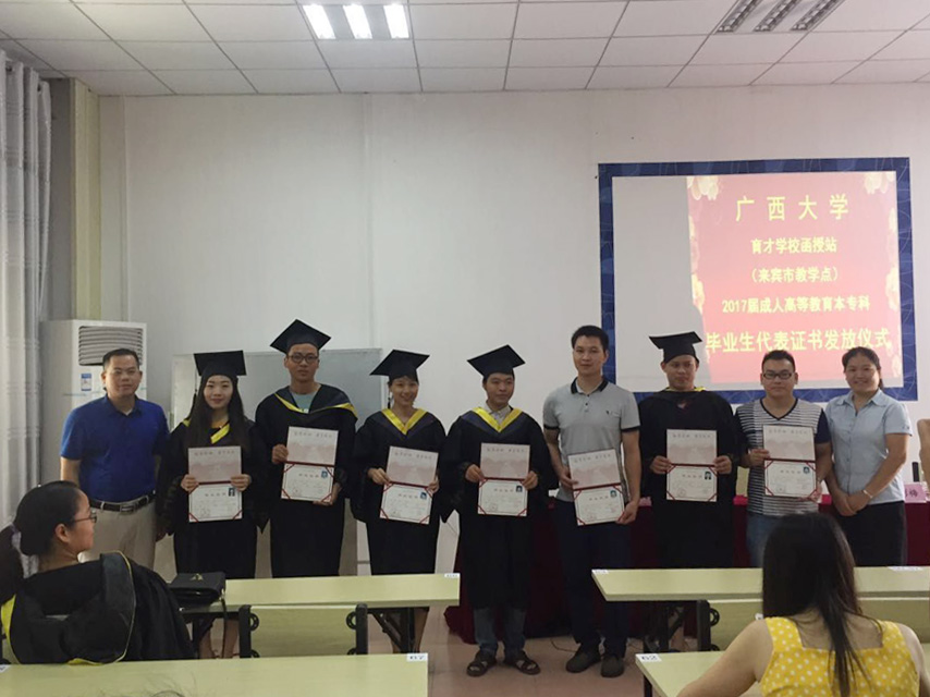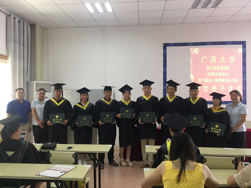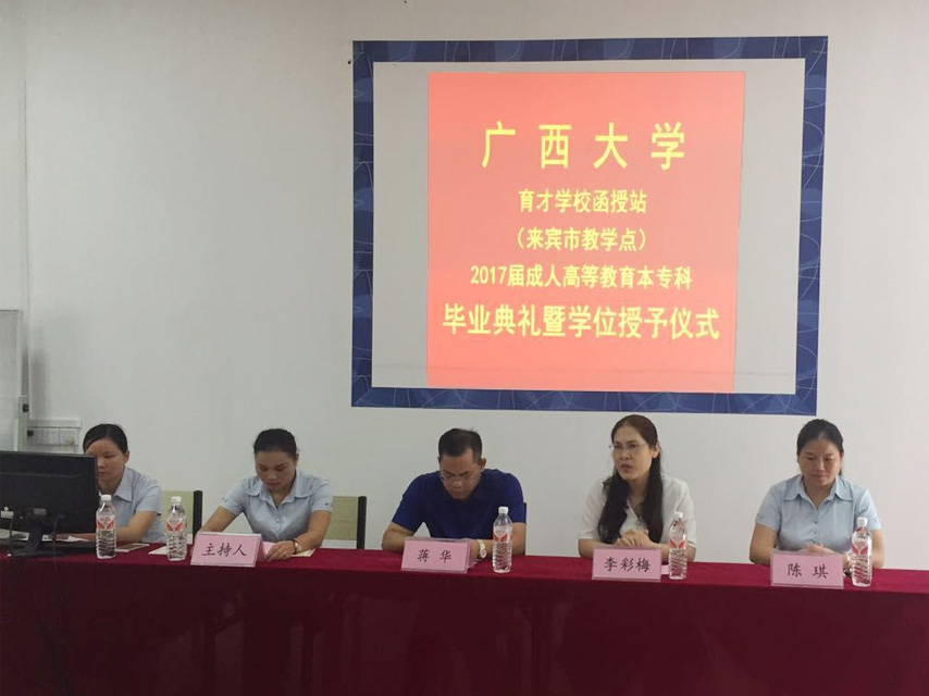 7月24日,廣西大學(xué)育才教育函授站來賓教學(xué)點2017屆成人高等教育本??飘厴I(yè)典禮暨學(xué)位授予儀式在育才來賓分校隆重舉行,育才教育黨支部書記,董事長蔣華、柳州市育才教育培訓(xùn)中心常務(wù)副校長李彩梅、來賓分校教學(xué)管理老師覃妍英、陳琪、羅慧芳以及來賓市各區(qū)、縣的50多名畢業(yè)生代表參加了典禮,典禮由覃妍英老師主持。