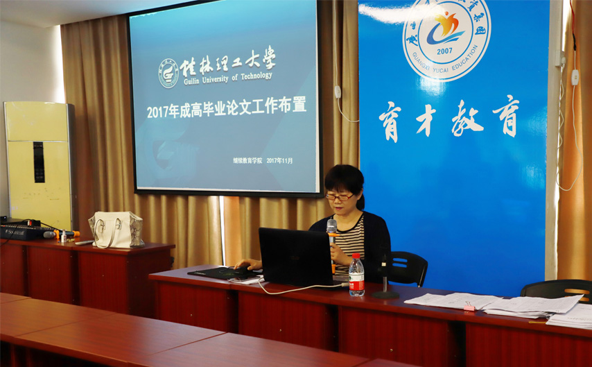 11月12日,桂林理工大學育才函授站召開了2016級畢業(yè)論文工作布置會議,桂林理工大學成教院教務(wù)科科長劉華老師出席會議并對畢業(yè)論文寫作主講,并提出了幾點要求和希望:一是要求畢業(yè)生高度重視畢業(yè)論文寫作;二是做好論文選題,認真撰寫;三是杜絕做假論文、抄襲論文。
