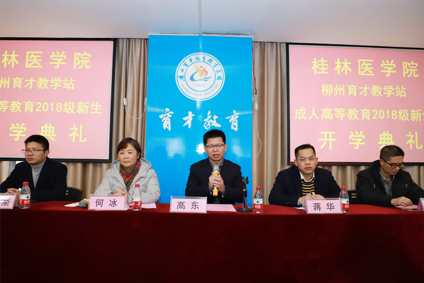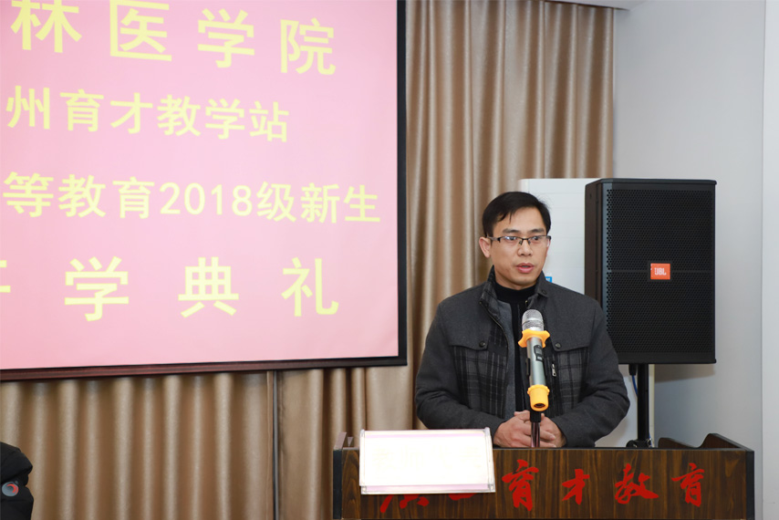 桂林醫(yī)學(xué)院繼續(xù)教育學(xué)院院長高東代表學(xué)校向全體成教新生表示誠摯的問候和熱烈的祝賀,對長期以來支持桂林醫(yī)學(xué)院成教工作的育才教育表示衷心的感謝。他著重介紹了學(xué)校的發(fā)展歷史、師資隊伍建設(shè)等情況以及近年來在成人高等繼續(xù)教育方面所取得的成績,并希望2018級的新同學(xué)從今天起就要謹(jǐn)記自己是桂醫(yī)人,有機會一定要到桂林醫(yī)學(xué)院校本部去感受美麗的校園環(huán)境和良好的學(xué)習(xí)氛圍。同時,要樹立信念,克服困難,把學(xué)歷提升和能力提升當(dāng)作是人生進階的重要目標(biāo)和家庭文化傳承來看待,在三年里認(rèn)真完成學(xué)業(yè),并養(yǎng)成自學(xué)的能力和終身學(xué)習(xí)的習(xí)慣,讓自己飛得更高,走得更遠(yuǎn)。