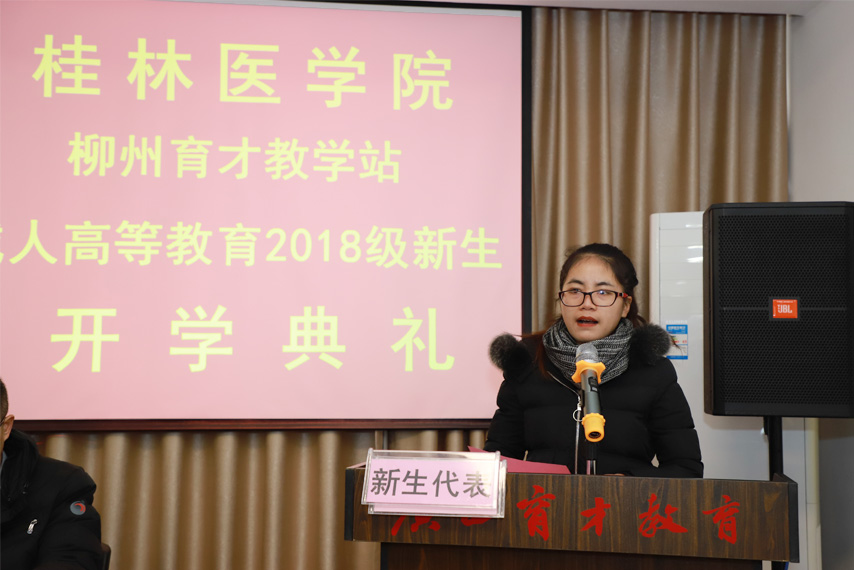 教師代表張安文老師在典禮上進行發(fā)言,表示將遵守各項規(guī)章制度和教學(xué)要求,結(jié)合專業(yè)特點以及學(xué)員個人需求,努力解答學(xué)員們的問題,營造良好的學(xué)習(xí)氛圍,讓大家順利完成學(xué)業(yè)。2018級專升本藥學(xué)專業(yè)的藍(lán)夢維同學(xué)代表新生發(fā)言,她表示報讀桂林醫(yī)學(xué)院是人生的一次突破,并將推動工作和事業(yè)的發(fā)展,要與同學(xué)們共同努力,相互促進,學(xué)有所成,學(xué)有所用,不斷充實和提高自己,無愧自己的選擇。