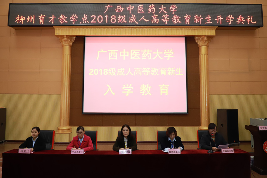 1月21日上午,廣西中醫(yī)藥大學育才教育校外輔導站2018級成人高等教育新生開學典禮在柳州總部順利召開。廣西中醫(yī)藥大學直屬黨委書記、成人繼續(xù)教育學院院長、博士生導師、二級教授韋艾凌、副院長黃瑞誠、院長助理、培訓部主任楊繼峰、廣西育才教育黨支部書記、輔導站站長蔣華老師、育才教育校長王志以及來自柳州醫(yī)學行業(yè)的100多名新生代表參加了開學典禮。
