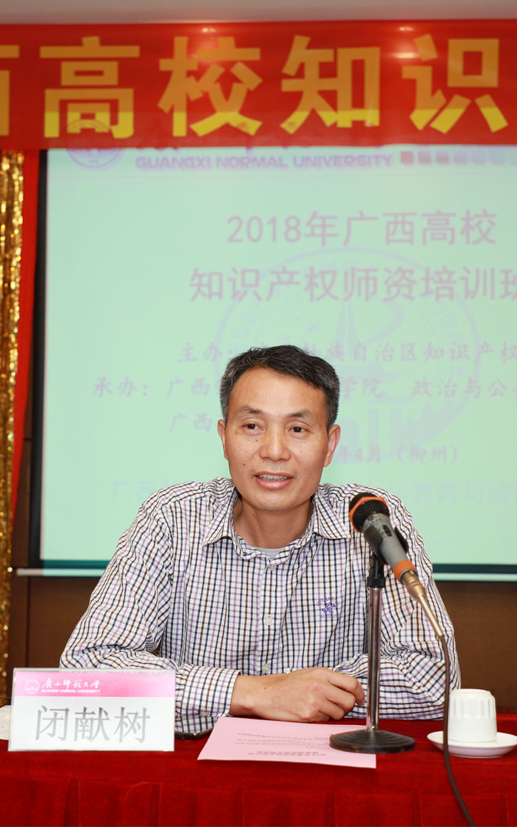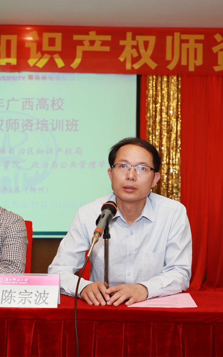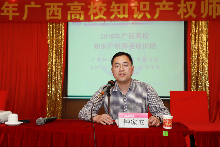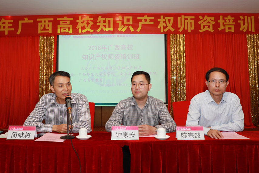 廣西知識產(chǎn)權(quán)局綜合處副調(diào)研員鐘家安、廣西師范大學(xué)科技處副處長畢獻樹、法學(xué)院院長、政治與公共管理學(xué)院院長、律師學(xué)院院長、中國--東盟青年社會組織發(fā)展研究院院長陳宗波博士、教授出席培訓(xùn)活動并就如何貫徹黨的十九大精神、加快知識產(chǎn)權(quán)強國建設(shè)、積極響應(yīng)國家雙創(chuàng)教育政策和提升廣西大學(xué)生創(chuàng)新創(chuàng)業(yè)人才培育的師資需求等進行發(fā)言。
