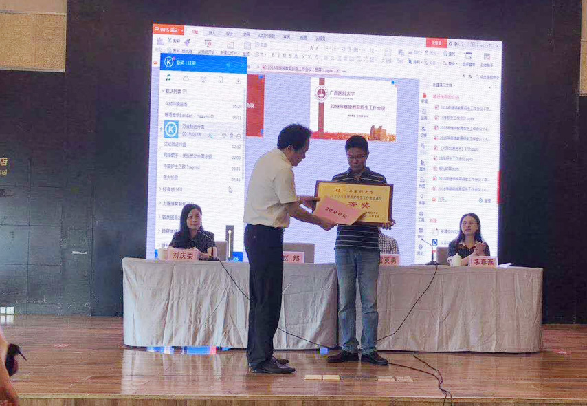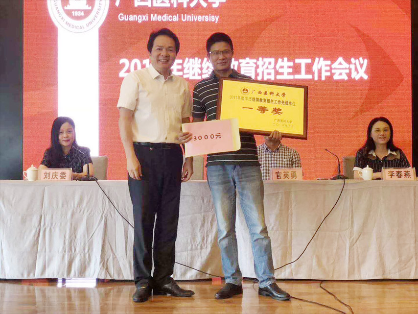 因工作出色,育才教育輔導(dǎo)站榮獲廣西醫(yī)科大學(xué)2017年度“學(xué)歷繼續(xù)教育招生工作先進(jìn)單位一等獎(jiǎng)”殊榮,王志、林華兩位老師榮獲“招生先進(jìn)個(gè)人”。輔導(dǎo)站副站長(zhǎng)蔣仕榮在會(huì)上作為先進(jìn)單位代表進(jìn)行了經(jīng)驗(yàn)分享。